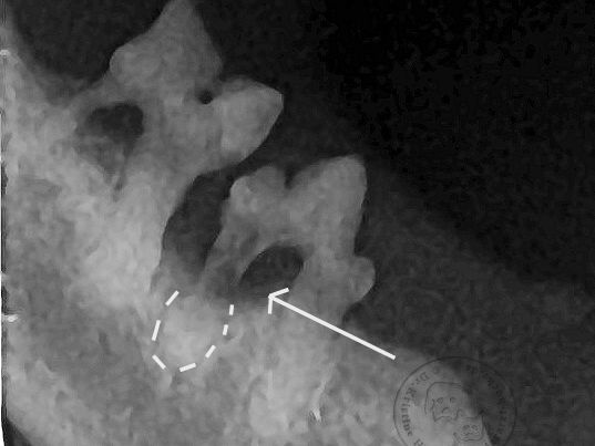 Der Pfeil zeigt den aufgelösten dunkleren Wurzelbereich, darunter ist aber auch noch ein intakter Wurzelteil in der gestrichelten Linie sichtbar, eine typische FORL-Erkrankung