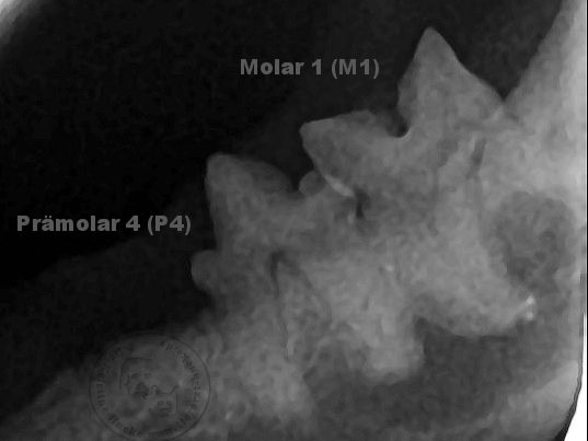 Ist die vordere Wurzel des Prämolar 4 und die beiden Wurzeln des Molar 4 vorsichtig herausgearbeitet sowie das noch zurückgebliebene letzte Zahnfragment entfernt, fehlt noch die Kontrolle ob wirklich alles entfernt ist.